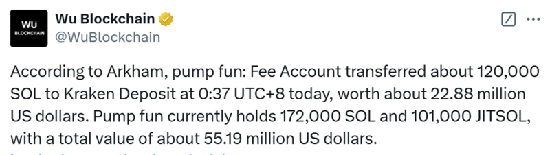 - Pump.fun reportedly deposited 120,000 SOL, approximately $22.88 million, to Kraken.