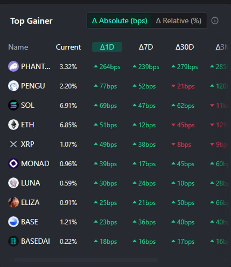 According to the top gainers on the AI-based Web3 search platform Kaito's Token Mindshare (a metric quantifying the influence of specific tokens in the cryptocurrency market), the top five cryptocurrencies that are currently attracting the most attention are Phantom, Pudgy Penguins, Solana (SOL), Ethereum (ETH), and Ripple.