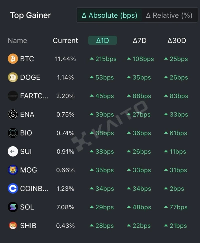 According to the top gainers on the AI-based Web3 search platform Kaito's Token Mindshare (a metric quantifying the influence of specific tokens in the crypto market), the top five cryptocurrencies currently attracting the most attention on the 4th are Bitcoin (BTC), Dogecoin (DOGE), Fartcoin (FARTCOIN), Etena (ENA), and Bioprotocol (BIO).