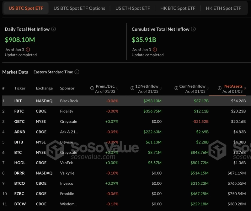According to data from Sosovalue on the 3rd (local time), $908.1 million has flowed into Bitcoin spot ETFs traded in the United States. Fidelity Bitcoin ETF ($357 million), BlackRock Bitcoin ETF ($253 million), and ARK Invest Bitcoin ETF ($222.63 million) led this net inflow reversal.