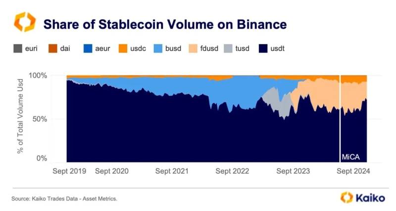 On the 3rd (local time), Unfolded reported on X that "the market share of USDT among stablecoins listed on Binance has risen to 75%," while "the market share of First Digital USD (FDUSD) has decreased." It further noted that "due to the implementation of the European MiCA law, the market share of USD Coin (USDC) has reached up to 7%."