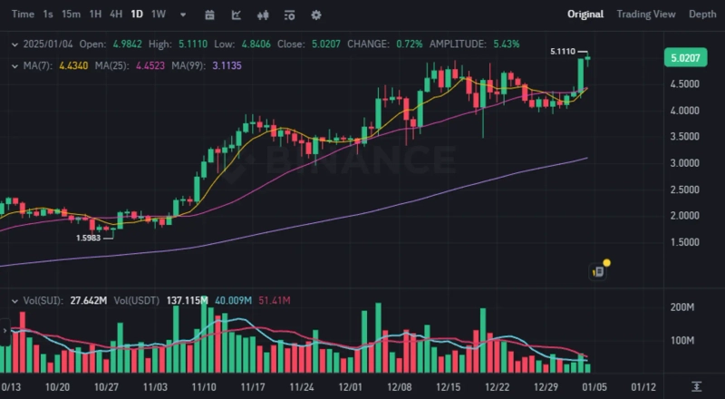 As of 17:58, Sui is trading at $5.0185 on the Binance USDT market, up 16.94% from 24 hours ago.