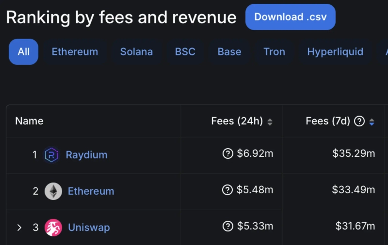 - Raydium's 24-hour fee revenue was $6.92 million, exceeding Ethereum and Uniswap.