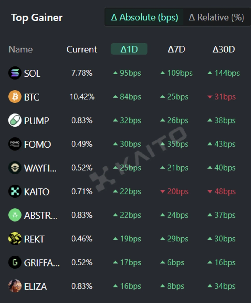 According to the top gainers in the Token Mindshare, a metric quantifying the influence of specific tokens in the cryptocurrency market, from the AI-based Web3 search platform Kaito, the top 5 cryptocurrency-related keywords currently attracting the most attention are Solana (SOL), Bitcoin (BTC), Pump.fun, FOMO, and Wayfinder.