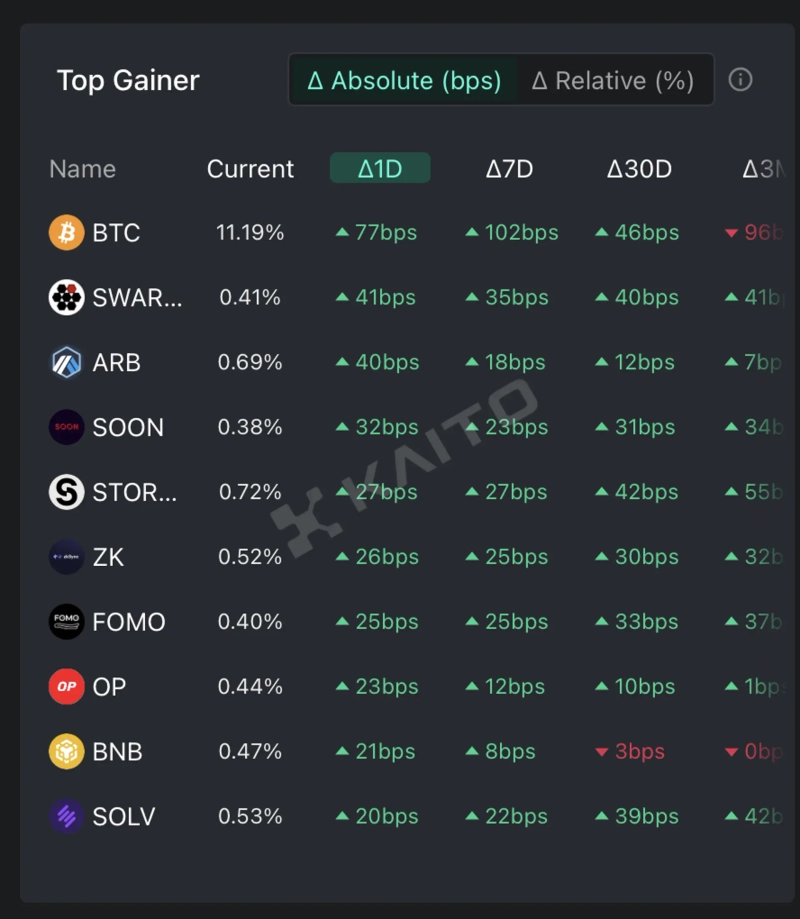 According to the top gainers on the AI-based Web3 search platform Kaito's Token Mindshare (a metric quantifying the influence of specific tokens in the cryptocurrency market), the top five cryptocurrency-related keywords currently attracting the most attention are Bitcoin (BTC), Arbitrum (ARB), Optimism (OP), Binance Coin (BNB), and Solve Protocol (SOLV).
