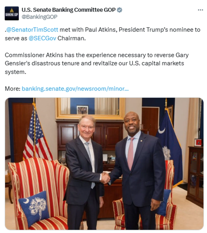 According to the official X (formerly Twitter) of the US Senate Banking Committee on the 7th (local time), Paul Atkins, the nominee for the new chairman of the US Securities and Exchange Commission (SEC) under the Donald Trump administration, visited the office of Tim Scott, a member of the US Senate Banking Committee, for a meeting.