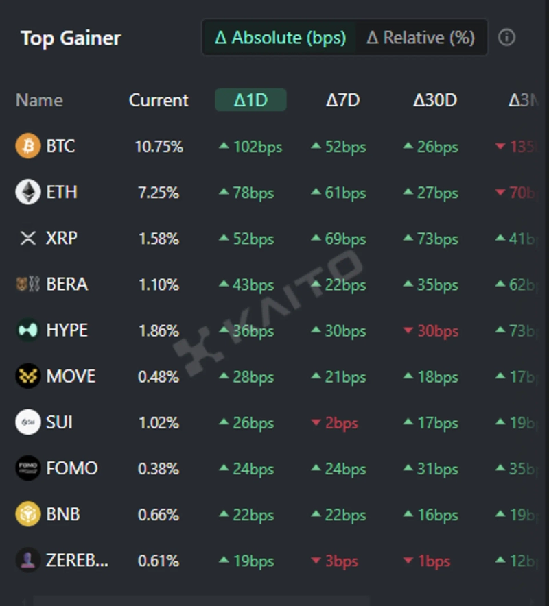 According to the top gainers on the AI-based Web3 search platform Kaito's Token Mindshare (a metric quantifying the influence of specific tokens in the crypto market), the top five cryptocurrencies currently garnering the most attention are Bitcoin (BTC), Ethereum (ETH), Ripple, Berachain (BERA), and Hyperliquid (HYPE).