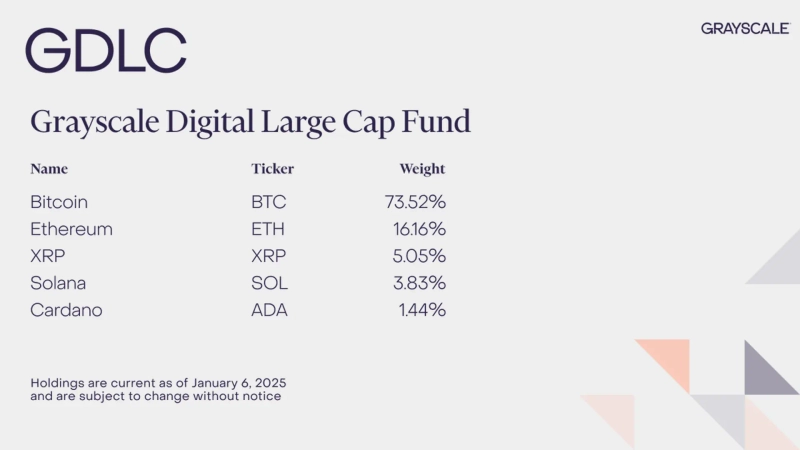 Currently, the GDLC portfolio consists of Bitcoin (BTC, 73.52%), Ethereum (ETH, 16.16%), Ripple (XRP, 5.05%), Solana (SOL, 3.83%), and Cardano (1.44%).