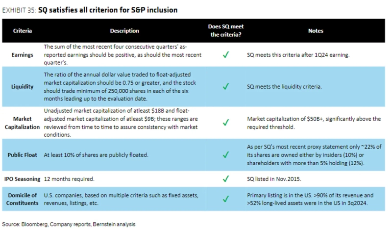 - Block has met all the index inclusion requirements after its first-quarter 2024 results and is expected to be included in the S&P 500 index within 3 to 21 months.