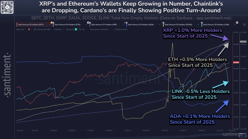 In particular, Ethereum (ETH) showed the largest growth. According to Santiment data, 645,000 new addresses have been created for Ethereum this year. During the same period, new addresses for Bitcoin (BTC) and Ripple (XRP) increased by 102,000 and 58,000, respectively, while Dogecoin (DOGE) and Cardano (ADA) added 29,000 and 2,800 addresses, respectively.