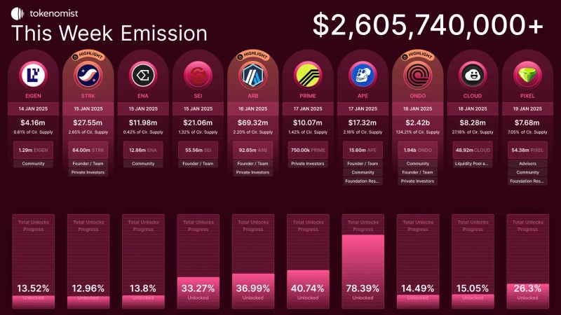 On the 10th (local time), Tokenomist (formerly Token Unlock) announced on X, "Major projects with tokens unlocking between the 13th and 19th," stating that "the scale of the tokens being unlocked is over $2.6 billion." They highlighted Ondo Finance (ONDO), Arbitrum (ARB), and Starknet (STRK) as projects to watch for token unlocks.