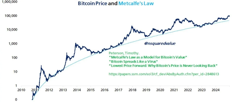 Peterson's Bitcoin price prediction model is designed according to Metcalfe's Law. According to Metcalfe's Law, the value of a network is proportional to the square of the number of its users (nodes). As Bitcoin's user base gradually expands, its value increases exponentially.
