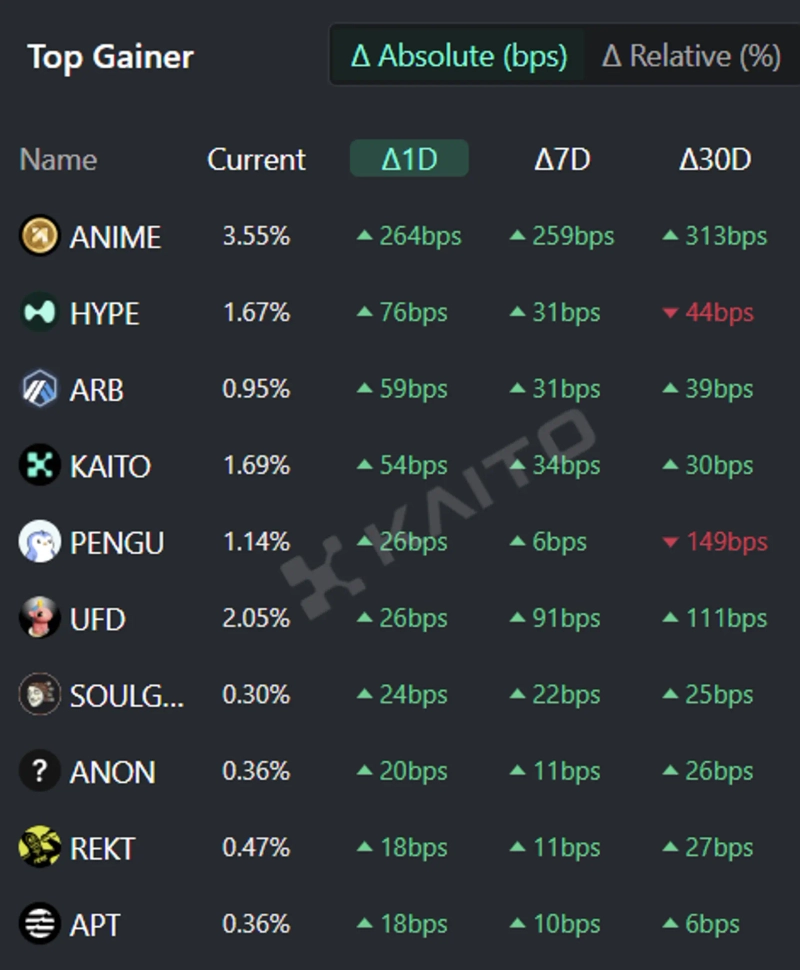 According to the top gainers on the Token Mindshare by the AI-based Web3 search platform Kaito, the top five cryptocurrency-related keywords that people are most interested in as of the 13th are AnimeCoin (ANIME), Hyperliquid, Arbitrum (ARB), Kaito, and Pudgy Penguins (PENGU).