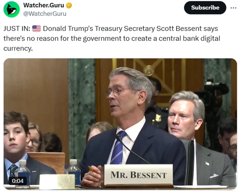 - Scott Bessent stated that there is no reason to create a CBDC.