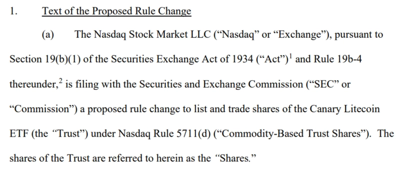 On the 16th (local time), Nate Geraci, president of the ETF Store, announced on his X account that "Nasdaq has submitted Form 19b-4 to the SEC, requesting approval for the trading of the Canary Litecoin ETF."