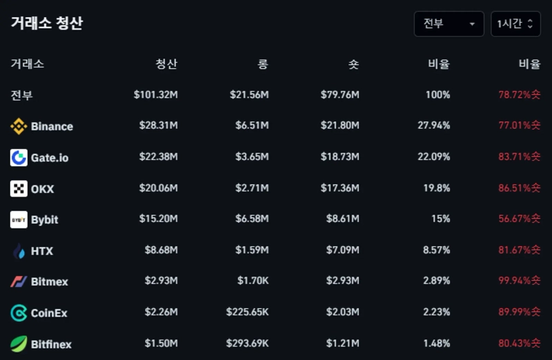 The exchange with the most position liquidations was Binance, with $28.31 million liquidated, followed by Gate.io ($22.38 million), OKX ($20.06 million), and Bybit ($15.20 million).
