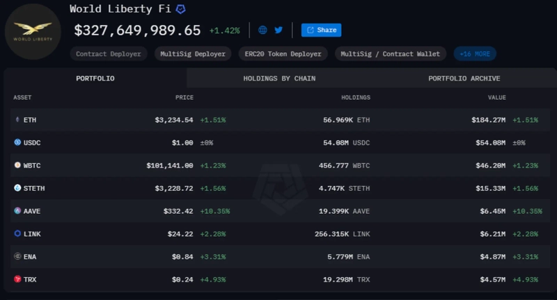 Other major cryptocurrencies held by World Liberty Financial include 54 million USD Coin (USDC) and 456,777 Wrapped Bitcoin (WBTC).