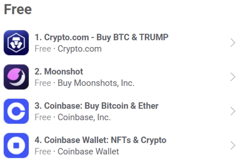 According to AppFigures data on the 21st (local time), Crypto.com is currently ranked first in the U.S. Apple App Store's free finance applications category. Following it, Moonshot is in second place, with Coinbase and Coinbase Wallet taking third and fourth places, respectively.