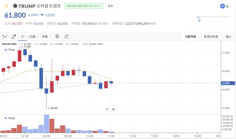 However, Official Trump is currently showing signs of a slight recovery. As of 11:14 AM that day, Official Trump is trading at 61,800 KRW on Coinone, down 4.84% from the previous day.