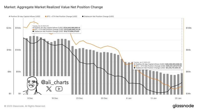 On the 22nd (local time), virtual asset analyst Ali Martinez stated on X, "The capital inflow into the virtual asset market has decreased by 63.3% since December 10 last year," adding that "the sharp decrease in capital inflow reflects a slowdown in investor market participation and liquidity."