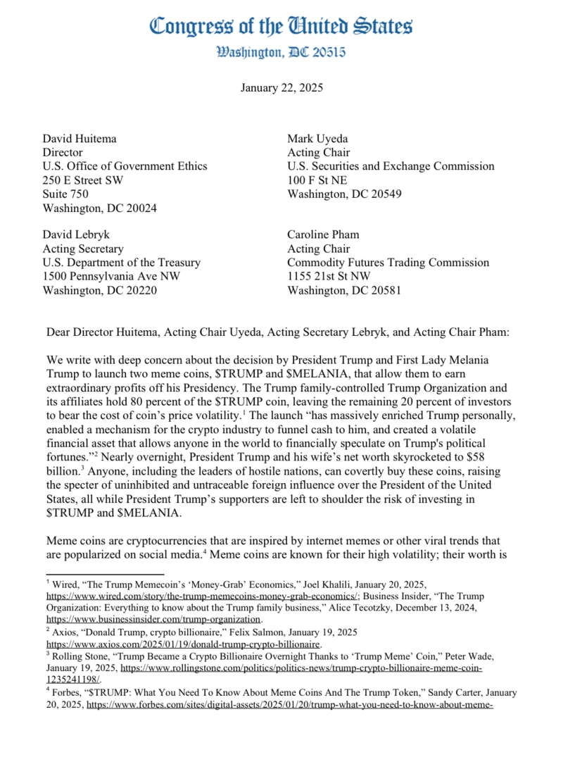 On the 22nd (local time), Senator Warren sent a letter to the U.S. Office of Government Ethics, the Securities and Exchange Commission (SEC), the Commodity Futures Trading Commission (CFTC), and the Department of the Treasury, requesting an investigation into whether the meme coin issued by President Trump violates ethics or regulations.