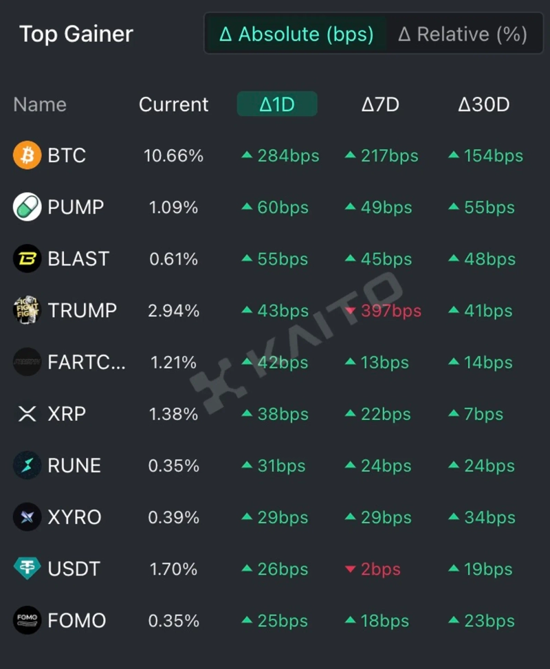 According to the top gainers on the AI-based Web3 search platform Kaito's Token Mindshare (a metric quantifying the influence of specific tokens in the virtual asset market), the top five crypto-related keywords currently attracting the most attention on the 24th are Bitcoin (BTC), PumpFun (PUMP), Blast (BLAST), OfficialTrump (TRUMP), and FartCoin (FARTCOIN).