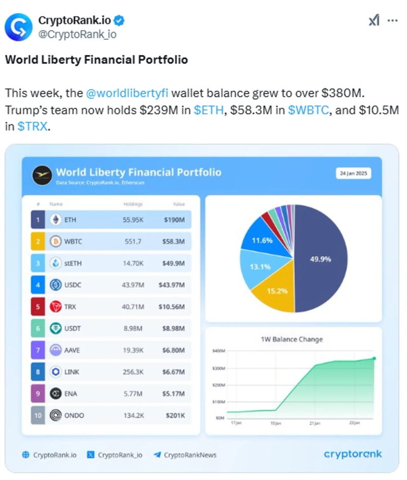 - It was reported that the wallet balance of the DeFi protocol World Liberty Financial, led by the Trump family, has increased to $380 million.