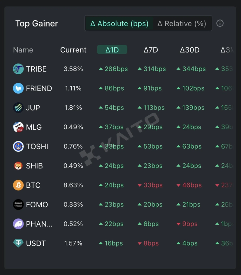 According to the top gainers on the AI-based Web3 search platform Kaito's Token Mindshare (a metric quantifying the influence of specific tokens in the crypto market), the top 5 crypto-related keywords currently attracting the most attention on the 27th are Jupiter (JUP), Toshi (TOSHI), Shiba Inu (SHIB), Bitcoin (BTC), and Tether (USDT).