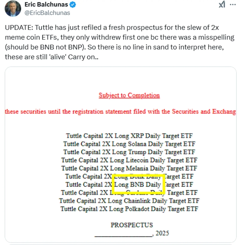 Eric Balchunas, Bloomberg's senior ETF analyst, reported on the 28th (local time) via official X (formerly Twitter) that "Tuttle Capital has submitted a new application for a 2X meme coin exchange-traded fund (ETF)," adding that "the application submitted the previous day seems to have been withdrawn due to a spelling error (submitted as BNP instead of BNB)."
