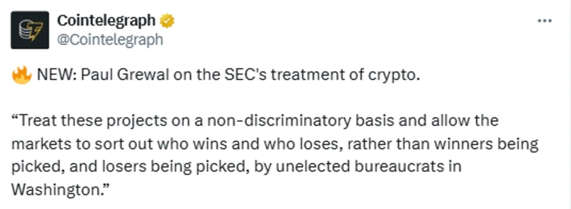 According to the virtual asset (cryptocurrency) specialized media Cointelegraph X (formerly Twitter) account on the 29th (local time), Paul Grewal, Chief Legal Officer (CLO) of Coinbase, stated in an interview that "the market, not Washington, should decide winners and losers, and all projects should be treated without discrimination."