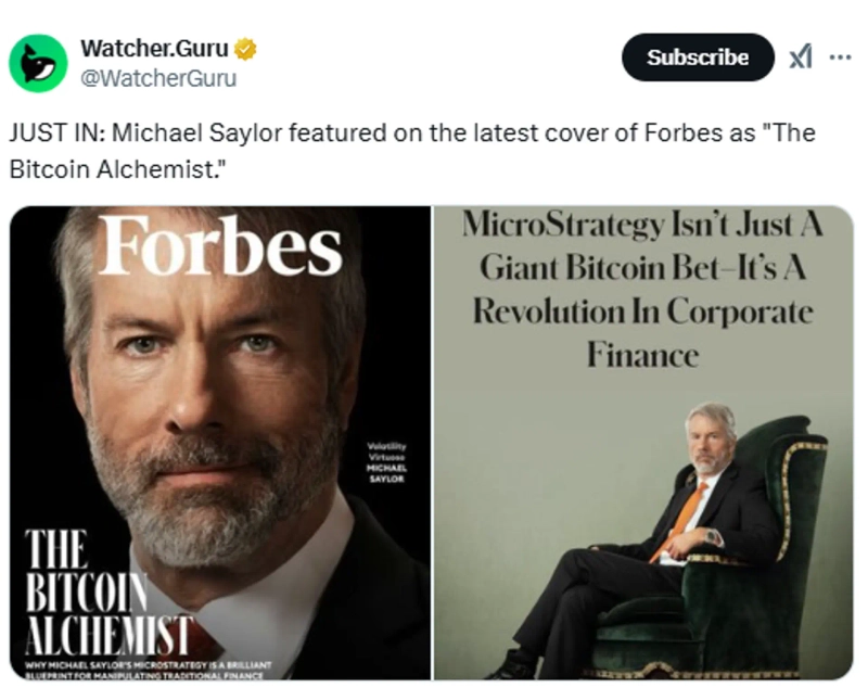 - The American economic magazine Forbes announced that Michael Saylor has been selected as the cover model, calling him The Bitcoin Alchemist.