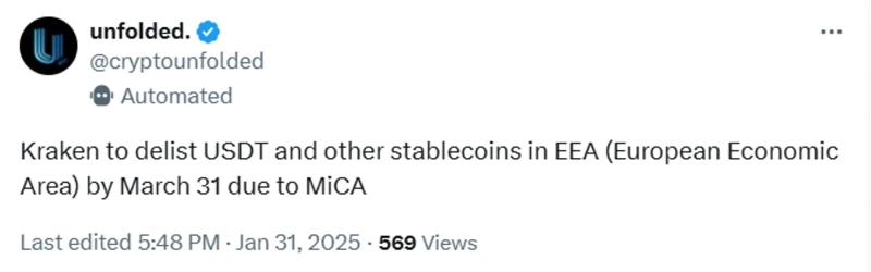 According to the Unfolded X (formerly Twitter) account, the cryptocurrency exchange Kraken announced that it will cease support for trading Tether (USDT) and other stablecoins within the European Economic Area (EEA) by March 31, 2024, in response to the implementation of the European crypto regulation MiCA.