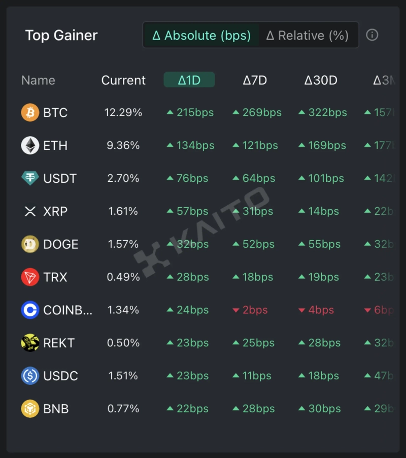 According to the top gainers in Token Mindshare (a metric quantifying the influence of specific tokens in the virtual asset market) by the AI-based Web3 search platform Kaito, the top five keywords related to virtual assets that people are most interested in as of the 3rd are Bitcoin (BTC), Ethereum (ETH), Tether (USDT), Ripple (XRP), and Dogecoin (DOGE).