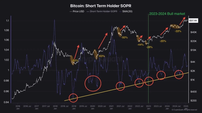 On the 3rd, CryptoQuant contributor Avocado Onchain reported that the Bitcoin (BTC) short-term investor SORP (Realized Profit Ratio) indicator is still showing only a 20-30% adjustment range, indicating that Bitcoin remains in a solid upward trend.