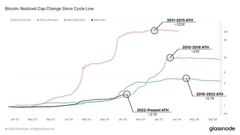 Currently, Bitcoin's growth rate in this cycle is recorded at 2.1 times from the bottom.