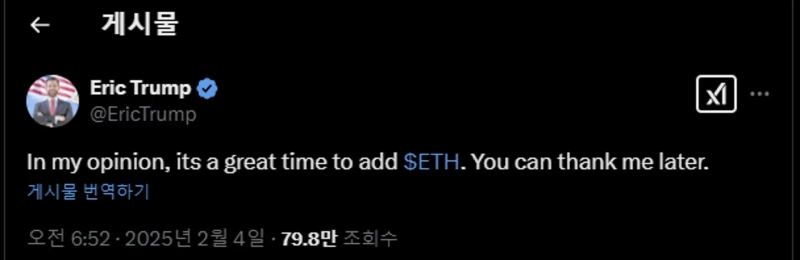 Eric Trump, the son of former U.S. President Donald Trump, stated on X (formerly Twitter) on the 4th that "now is a good time to buy Ethereum."