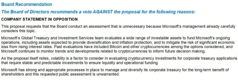 Previously, Microsoft's board of directors expressed opposition to the Bitcoin investment proposal, citing the volatility of Bitcoin as an issue. Typically, the official opinion of the board of directors greatly influences institutional investors and small shareholders, determining whether a proposal passes.