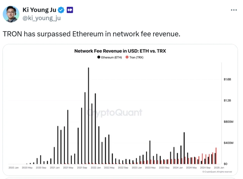 Ki Young Ju, CEO of CryptoQuant, reported on the 5th (local time) via X (formerly Twitter) that "TRON (TRX) has surpassed Ethereum (ETH) in network fee revenue."