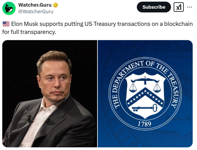 - Elon Musk reportedly supports the introduction of blockchain-based U.S. Treasury transactions.