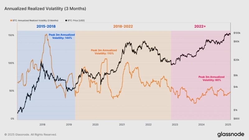 Recently, Bitcoin has quickly recovered after plunging due to concerns over the 'tariff bomb.' On-chain analysis platform Glassnode reported on the 4th that "Bitcoin showed a rapid rebound after a sharp decline over the weekend following the Trump administration's tariff announcement," adding that "new capital inflows from institutions and high-net-worth investors limited the losses even during the adjustment phase." Compared to the bull markets of 2017 and 2021, recent Bitcoin volatility has decreased significantly.
