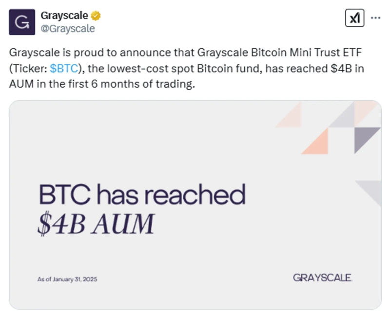 The virtual asset (cryptocurrency) asset management company Grayscale announced on the 6th (local time) via X (formerly Twitter) that the Grayscale Bitcoin (BTC) Mini Trust ETF has surpassed $4 billion in assets under management just six months after its launch.