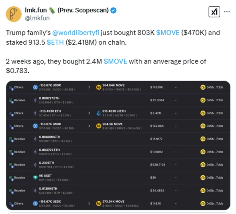lmk.fun (formerly ScopeScan) announced on the 10th (local time) via official X (formerly Twitter) that "Trump family's DeFi project World Liberty Financial (WLFI) has just purchased 803,000 Movement (MOVE, approximately $470,000) and staked 913.5 Ethereum (ETH, approximately $2.418 million) on the chain."
