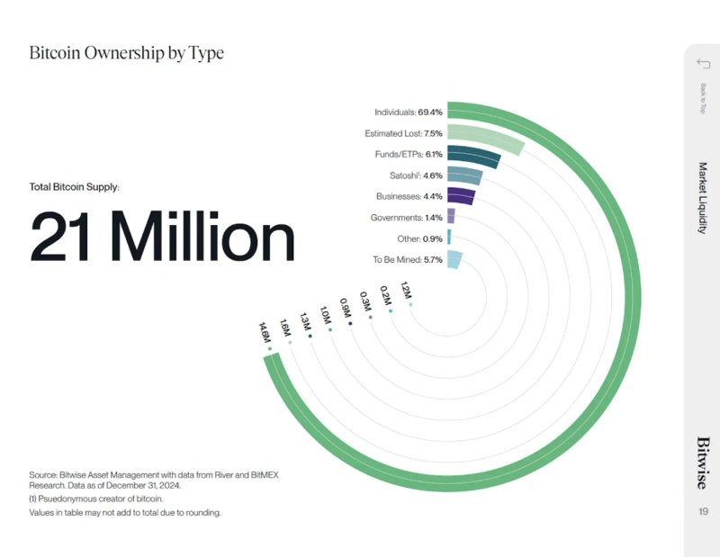 The Bitwise report shows the distribution of the total supply of Bitcoin. Individual investors hold 69.4% of all Bitcoin. Governments and corporations own 5.8% of Bitcoin.