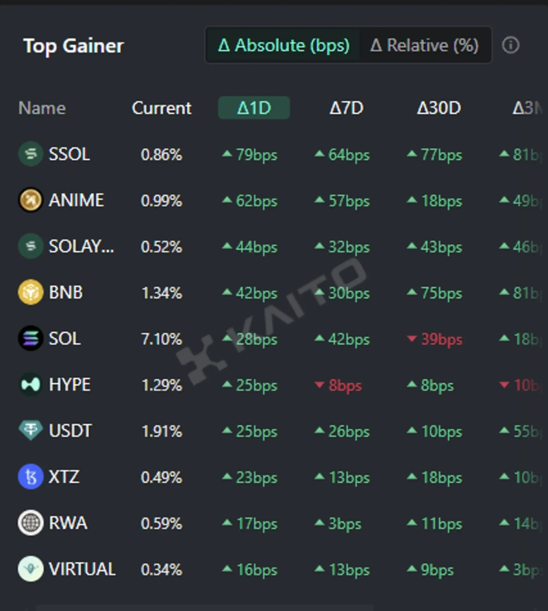 According to the top gainers on the AI-based Web3 search platform Kaito's Token Mindshare (a metric quantifying the influence of specific tokens in the crypto market), the top 5 crypto-related keywords currently attracting the most attention are Soleil Solana (SSOL), Anime Coin (ANIME), Soleil (LAYER), Binance Coin (BNB), and Solana (SOL).