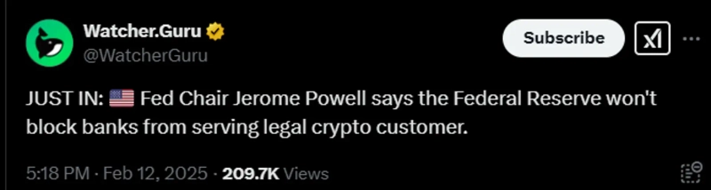 According to the cryptocurrency-focused media Watcher Guru X (formerly Twitter) account on the 12th (local time), Jerome Powell, Chairman of the Federal Reserve, stated, "The Fed will not prevent banks from providing services to legitimate cryptocurrency customers," adding that "many aspects of crypto-related activities can be sufficiently conducted within banks."
