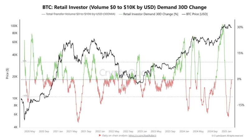 On the 13th (local time), CryptoQuant author caueconomy analyzed, "Retail investor activity has decreased by about 2% over the past 30 days, which is a significant improvement from -20% recorded in January," adding that "periods of increased monthly retail investor demand typically coincide with improved market sentiment and are positive factors for price appreciation."