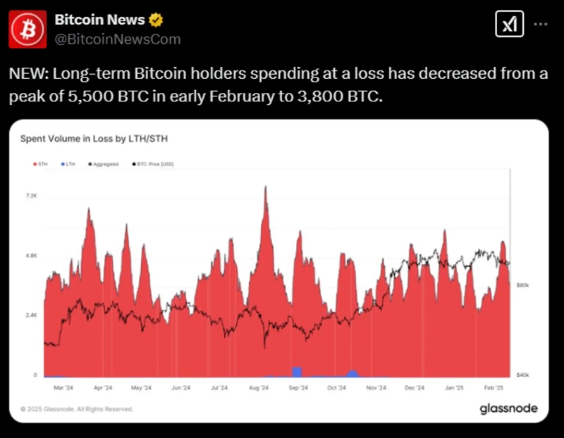 On the 14th (local time), cryptocurrency media Bitcoin News reported, citing Glassnode data, that Bitcoin (BTC) Long-Term Holder (LTH) loss volume decreased by approximately 31% from 5500 BTC to 3800 BTC since early February.