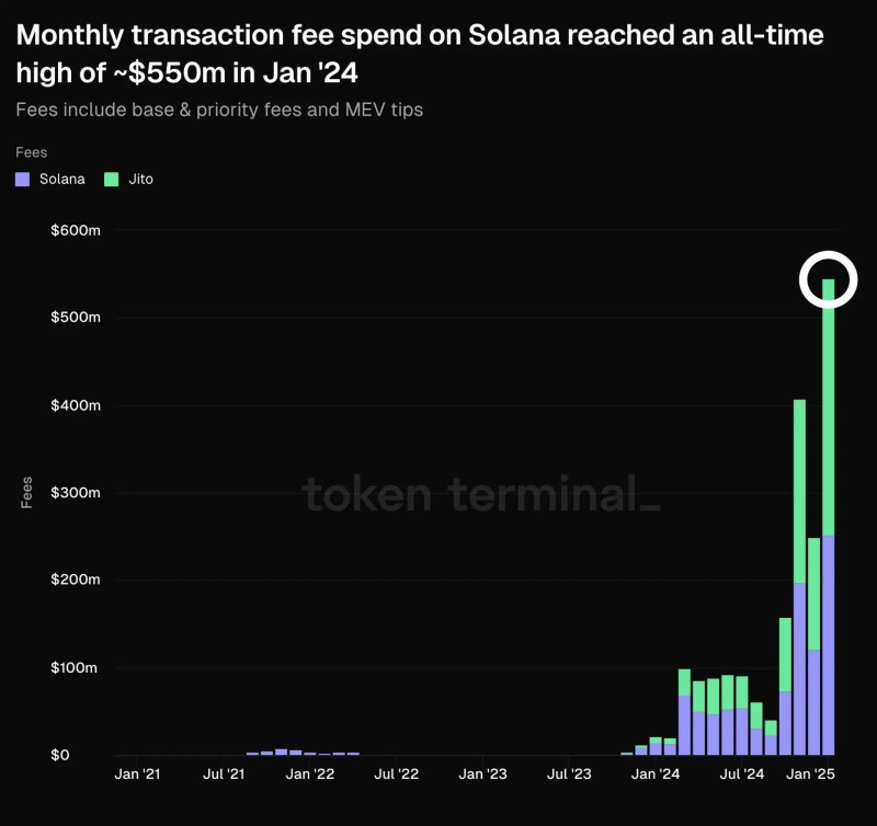 - Solana's monthly transaction fees reached $550 million, marking an all-time high.
