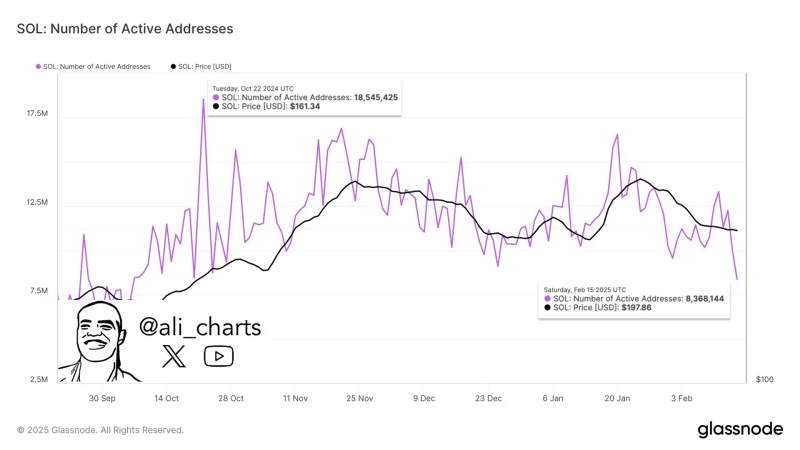 Solana (SOL) network's active addresses have shown a significant decrease.