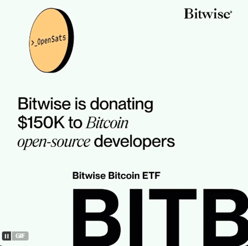 - Bitwise announced a donation of $150,000 to support Bitcoin (BTC) open-source developers.